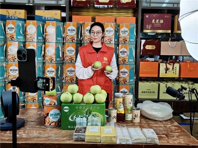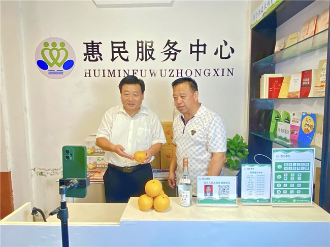 图为烟草工作人员(左)正在指导零售户直播带货,进一步拓宽冠县鸭梨销售经营渠道。张克凡摄